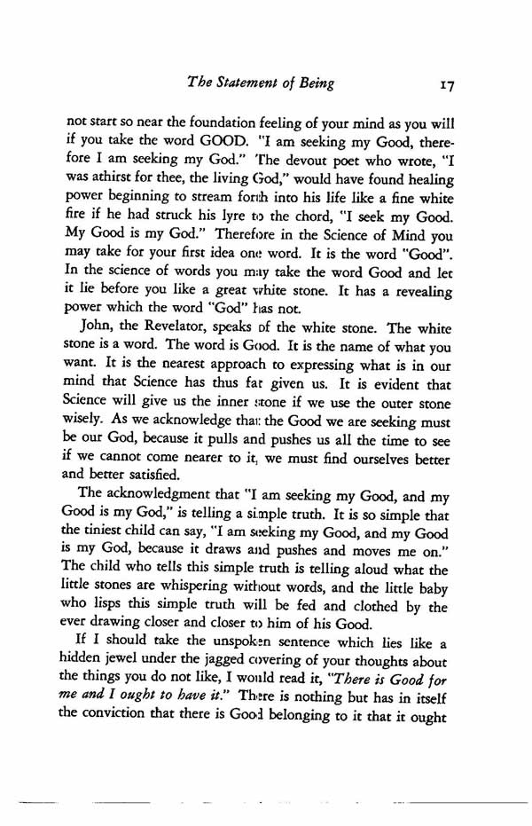 not start so near the foundation feeling of your mind as you will if you take the word GOOD. "I am seeking my Good, therefore I am seeking my God." The devout poet who wrote, "I was athirst for thee, the living God," would have found healing power beginning to stream forth into his life like a fine white fire if he had struck his lyre to the chord, "I seek my Good. My Good is my God." Therefore in the Science of Mind you may take for your first idea one word. It is the word "Good". In the science of words you may take the word Good and let it lie before you like a great white stone. It has a revealing power which the word "God" has not.