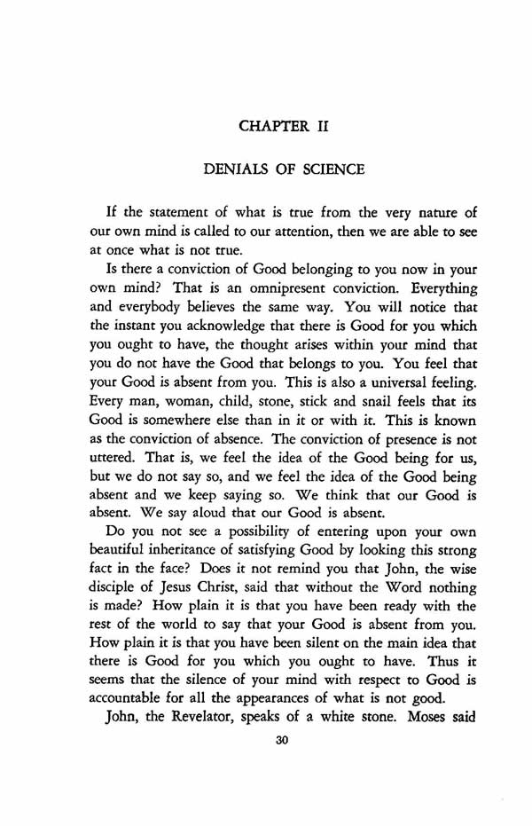 Is there a conviction of Good belonging to you now in your own mind? That is an omnipresent conviction. Everything and everybody believes the same way. You will notice that the instant you acknowledge that there is Good for you which you ought to have, the thought arises within your mind that you do not have the Good that belongs to you. You feel that your Good is absent from you. This is also a universal feeling. Every man, woman, child, stone, stick and snail feels that its Good is somewhere else than in it or with it. This is known as the conviction of absence. The conviction of presence is not uttered. That is, we feel the idea of the Good being for us, but we do not say so, and we feel the idea of the Good being absent and we keep saying so. We think that our Good is absent. We say aloud that our Good is absent.
