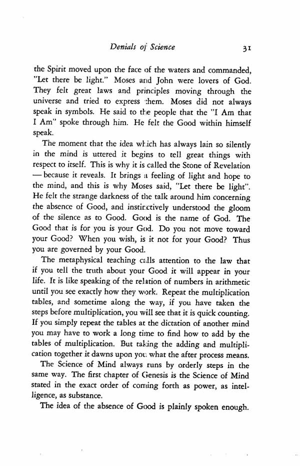 The metaphysical teaching calls attention to the law that if you tell the truth about your Good it will appear in your life. It is like speaking of the relation of numbers in arithmetic until you see exactly how they work. Repeat the multiplication tables, and sometime along the way, if you have taken the steps before multiplication, you will see that it is quick counting. If you simply repeat the tables at the dictation of another mind you may have to work a long time to find how to add by the tables of multiplication. But taking the adding and multiplication together it dawns upon you what the after process means.
