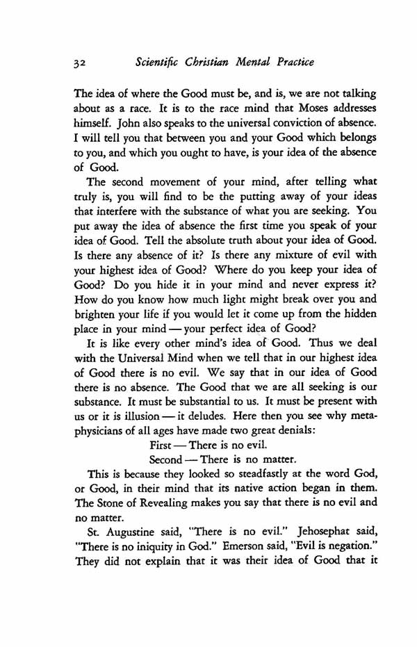 It is like every other mind's idea of Good. Thus we deal with the Universal Mind when we tell that in our highest idea of Good there is no evil. We say that in our idea of Good there is no absence. The Good that we are all seeking is our substance. It must be substantial to us. It must be present with us or it is illusion it deludes. Here then you see why metaphysicians of all ages have made two great denials: