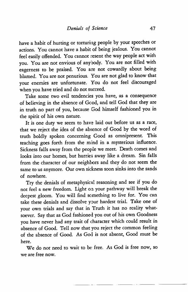 Try the denials of metaphysical reasoning and see if you do not feel a new freedom. Light on your pathway will break the deepest gloom. You will find something to live for. You can take these denials and dissolve your hardest trial. Take one of your own trials and say that in Truth it has no reality whatsoever. Say that as God fashioned you out of his own Goodness you have never had any trait of character which could result in absence of Good. Tell now that you reject the common feeling of the absence of Good. As God is not absent, Good must be here.