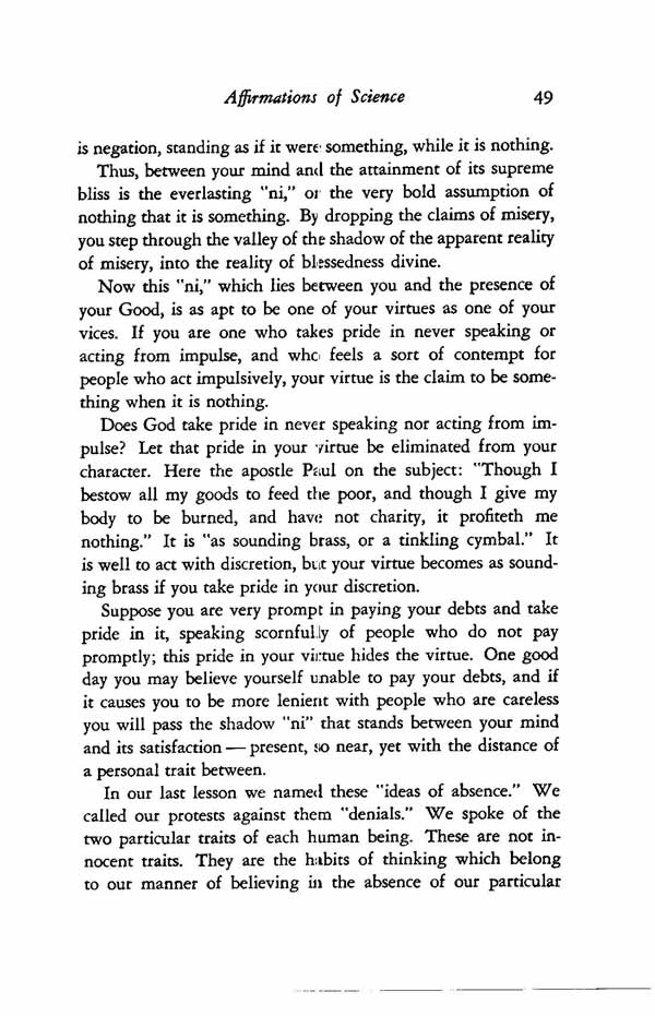 Suppose you are very prompt in paying your debts and take pride in it, speaking scornfully of people who do not pay promptly; this pride in your virtue hides the virtue. One good day you may believe yourself unable to pay your debts, and if it causes you to be more lenient with people who are careless you will pass the shadow "ni" that stands between your mind and its satisfaction present, so near, yet with the distance of a personal trait between.