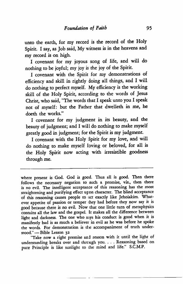 I covenant with the Spirit for my demonstrations of efficiency and skill in rightly doing all things, and I will do nothing to perfect myself. My efficiency is the working skill of the Holy Spirit, according to the words of Jesus Christ, who said, "The words that I speak unto you I speak not of myself : but the Father that dwelleth in me, he doeth the works."