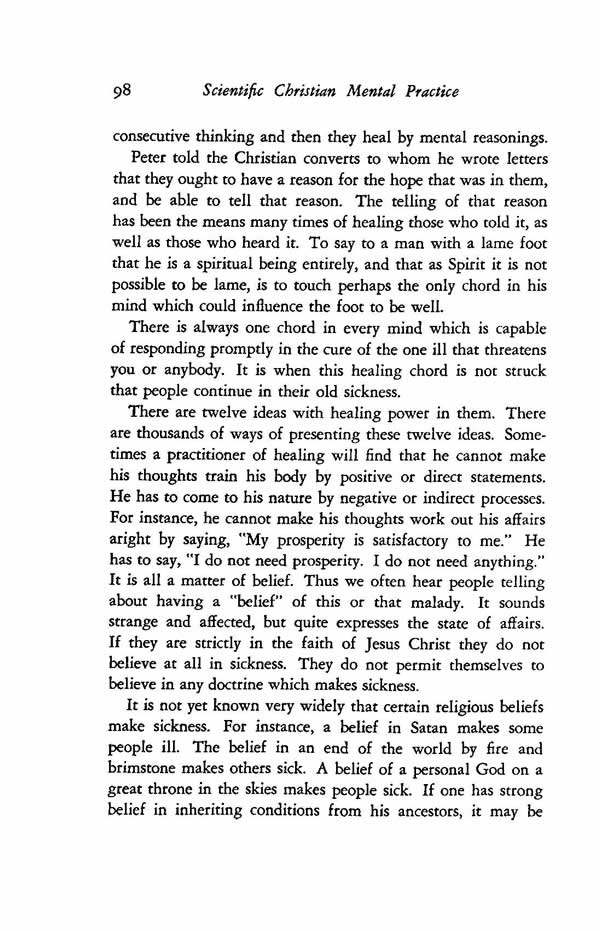 There are twelve ideas with healing power in them. There are thousands of ways of presenting these twelve ideas. Sometimes a practitioner of healing will find that he cannot make his thoughts train his body by positive or direct statements. He has to come to his nature by negative or indirect processes. For instance, he cannot make his thoughts work out his affairs aright by saying, "My prosperity is satisfactory to me." He has to say, "I do not need prosperity. I do not need anything." It is all a matter of belief. Thus we often hear people telling about having a "belief" of this or that malady. It sounds strange and affected, but quite expresses the state of affairs. If they are strictly in the faith of Jesus Christ they do not believe at all in sickness. They do not permit themselves to believe in any doctrine which makes sickness.