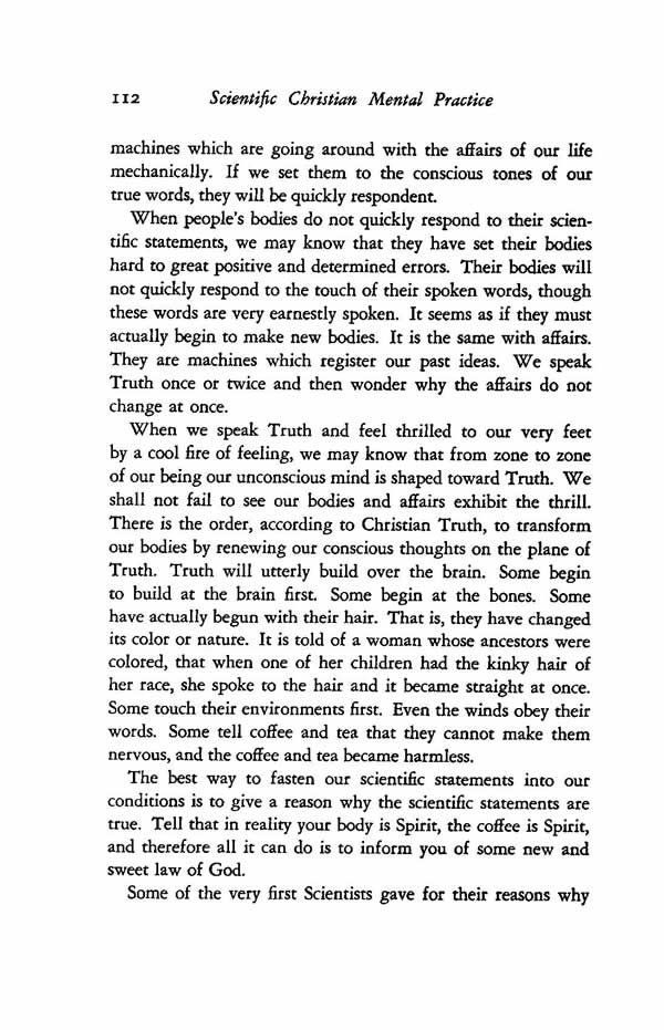 When people's bodies do not quickly respond to their scientific statements, we may know that they have set their bodies hard to great positive and determined errors. Their bodies will not quickly respond to the touch of their spoken words, though these words are very earnestly spoken. It seems as if they must actually begin to make new bodies. It is the same with affairs. They are machines which register our past ideas. We speak Truth once or twice and then wonder why the affairs do not change at once.