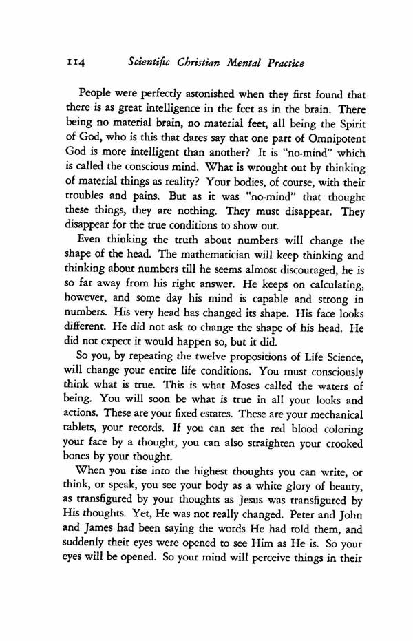 People were perfectly astonished when they first found that there is as great intelligence in the feet as in the brain. There being no material brain, no material feet, all being the Spirit of God, who is this that dares say that one part of Omnipotent God is more intelligent than another? It is "no-mind" which is called the conscious mind. What is wrought out by thinking of material things as reality? Your bodies, of course, with their troubles and pains. But as it was "no-mind" that thought these things, they are nothing. They must disappear. They disappear for the true conditions to show out.