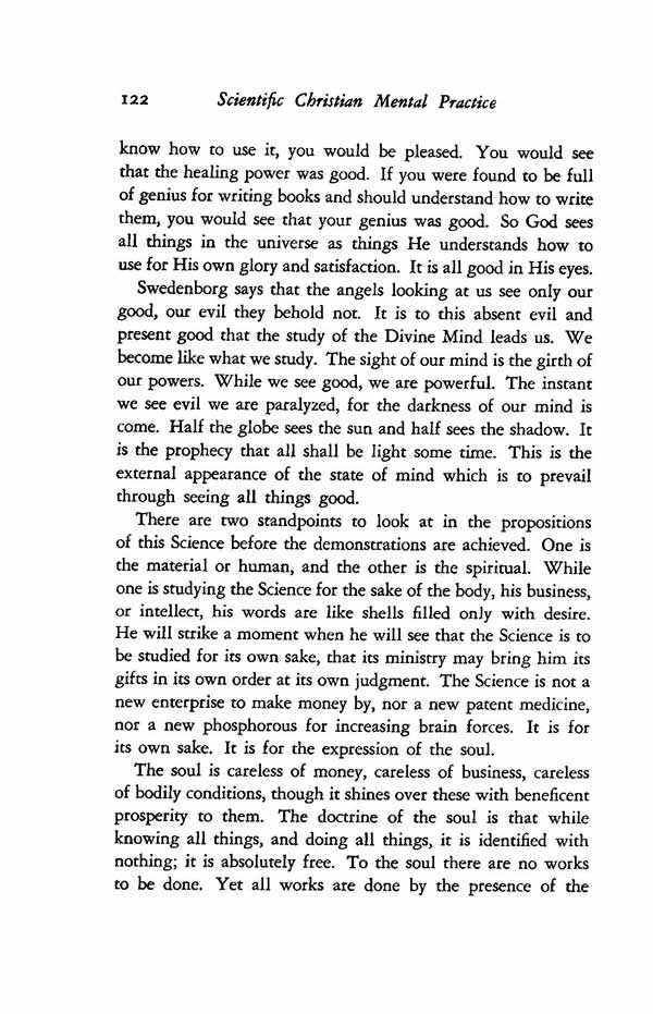 Swedenborg says that the angels looking at us see only our good, our evil they behold not. It is to this absent evil and present good that the study of the Divine Mind leads us. We become like what we study. The sight of our mind is the girth of our powers. While we see good, we are powerful. The instant we see evil we are paralyzed, for the darkness of our mind is come. Half the globe sees the sun and half sees the shadow. It is the prophecy that all shall be light some time. This is the external appearance of the state of mind which is to prevail through seeing all things good.