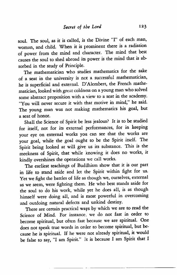 There are certain practical ways by which we are to read the Science of Mind. For instance, we do not fast in order to become spiritual, but often fast because we are spiritual. One does not speak true words in order to become spiritual, but because he is spiritual. If he were not already spiritual, it would be false to say, "I am Spirit." It is because I am Spirit that I