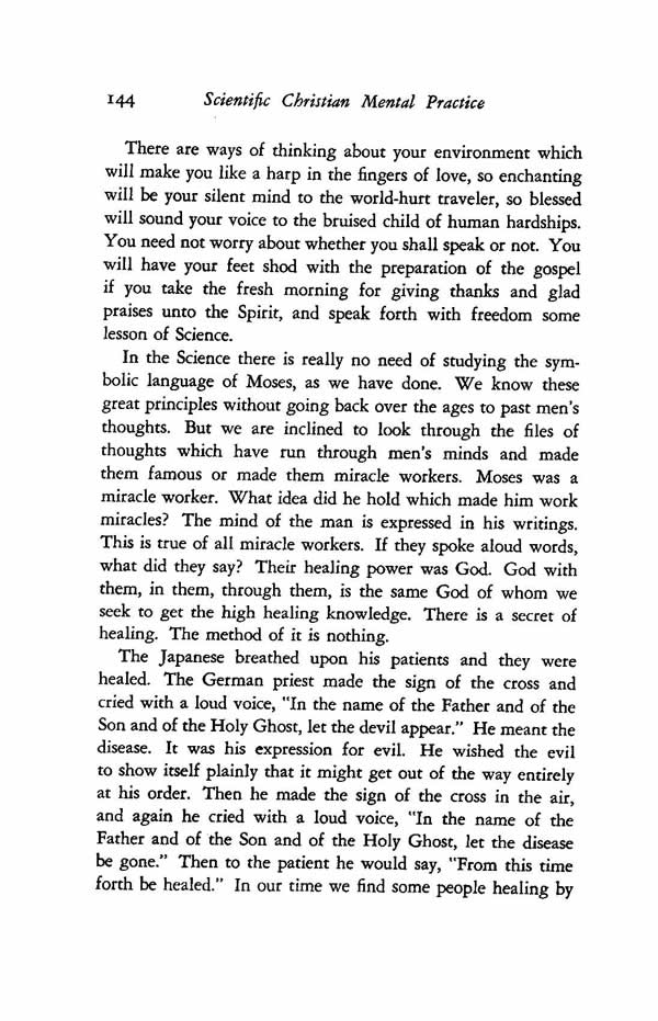 The Japanese breathed upon his patients and they were healed. The German priest made the sign of the cross and cried with a loud voice, "In the name of the Father and of the Son and of the Holy Ghost, let the devil appear." He meant the disease. It was his expression for evil. He wished the evil to show itself plainly that it might get out of the way entirely at his order. Then he made the sign of the cross in the air, and again he cried with a loud voice, "In the name of the Father and of the Son and of the Holy Ghost, let the disease be gone." Then to the patient he would say, "From this time forth be healed." In our time we find some people healing by