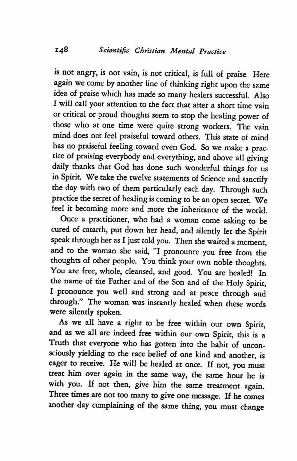 is not angry, is not vain, is not critical, is full of praise. Here again we come by another line of thinking right upon the same idea of praise which has made so many healers successful. Also I will call your attention to the fact that after a short time vain or critical or proud thoughts seem to stop the healing power of those who at one time were quite strong workers. The vain mind does not feel praiseful toward others. This state of mind has no praiseful feeling toward even God. So we make a practice of praising everybody and everything, and above all giving daily thanks that God has done such wonderful things for us in Spirit. We take the twelve statements of Science and sanctify the day with two of them particularly each day. Through such practice the secret of healing is coming to be an open secret. We feel it becoming more and more the inheritance of the world.