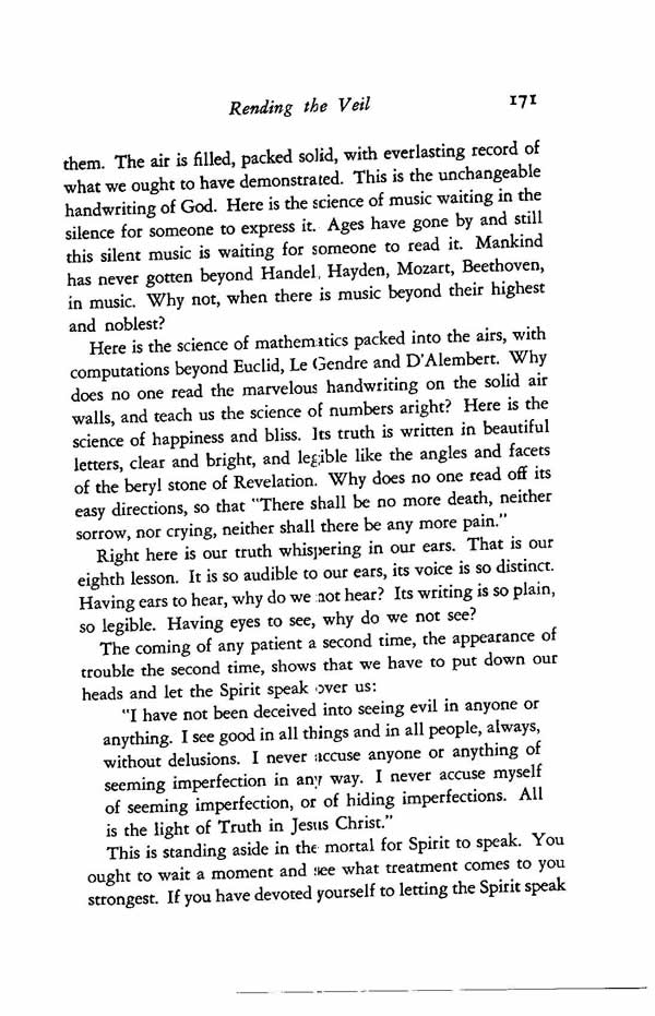 them. The air is filled, packed solid, with everlasting record of what we ought to have demonstrated. This is the unchangeable handwriting of God. Here is the science of music waiting in the silence for someone to express it. Ages have gone by and still this silent music is waiting for someone to read it. Mankind has never gotten beyond Handel, Hayden, Mozart, Beethoven, in music. Why not, when there is music beyond their highest and noblest?