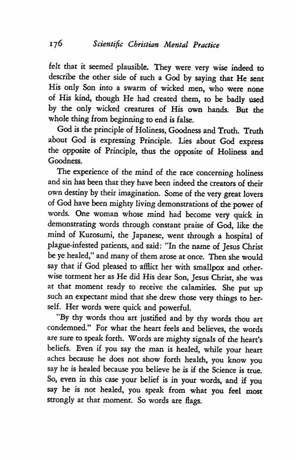 The experience of the mind of the race concerning holiness and sin has been that they have been indeed the creators of their own destiny by their imagination. Some of the very great lovers of God have been mighty living demonstrations of the power of words. One woman whose mind had become very quick in demonstrating words through constant praise of God, like the mind of Kurosumi, the Japanese, went through a hospital of plague-infested patients, and said: "In the name of Jesus Christ be ye healed," and many of them arose at once. Then she would say that if God pleased to afflict her with smallpox and otherwise torment her as He did His dear Son, Jesus Christ, she was at that moment ready to receive the calamities. She put up such an expectant mind that she drew those very things to herself. Her words were quick and powerful.