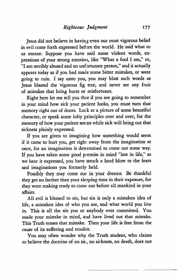 Jesus did not believe in having even our most vigorous belief in evil come forth expressed before the world. He said what to us means: Suppose you have said some violent words, expressions of your strong emotion, like "What a fool I am," or, "I am terribly abused and an unfortunate person," and it actually appears today as if you had made some bitter mistakes, or were going to ruin. I say unto you, you may blast such words as Jesus blasted the vigorous fig tree, and never see any fruit of mistakes that bring hurts or misfortunes.