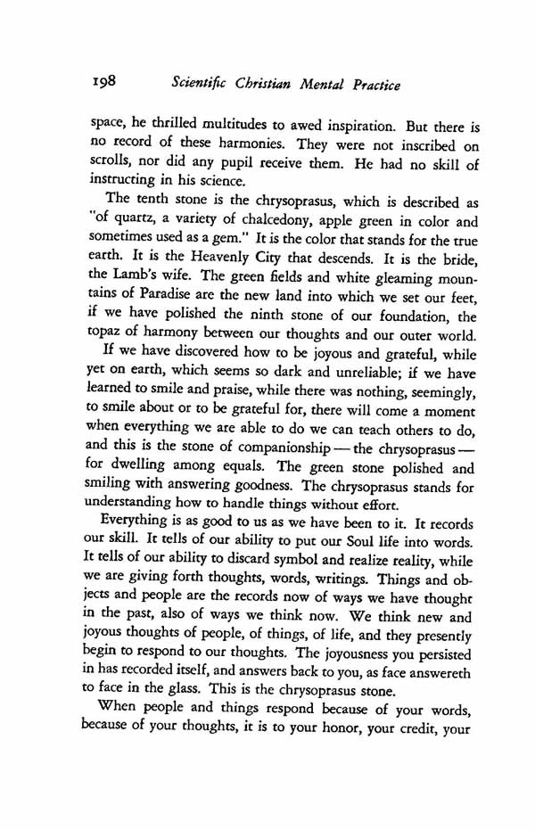 Everything is as good to us as we have been to it. It records our skill. It tells of our ability to put our Soul life into words. It tells of our ability to discard symbol and realize reality, while we are giving forth thoughts, words, writings. Things and objects and people are the records now of ways we have thought in the past, also of ways we think now. We think new and joyous thoughts of people, of things, of life, and they presently begin to respond to our thoughts. The joyousness you persisted in has recorded itself, and answers back to you, as face answereth to face in the glass. This is the chrysoprasus stone.