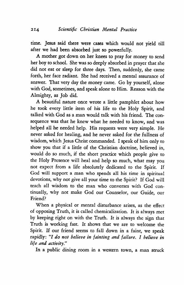 When a physical or mental disturbance arises, as the effect of opposing Truth, it is called chemicalization. It is always met by keeping right on with the Truth. It is always the sign that Truth is working fast. It shows that we are to welcome the Spirit. If our friend seems to fall down in a faint, we speak rapidly: "I do not believe in fainting and failure. I believe in life and activity."