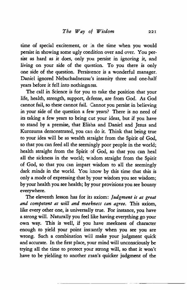 The eleventh lesson has for its axiom: Judgment is as great and competent as will and meekness can agree. This axiom, like every other one, is universally true. For instance, you have a strong will. Naturally you feel like having everything go your own way. This is well, if you have meekness of character enough to yield your point instantly when you see you are wrong. Such a combination will make your judgment quick and accurate. In the first place, your mind will unconsciously be trying all the time to protect your strong will, so that it won't have to be yielding to another man's quicker judgment of the