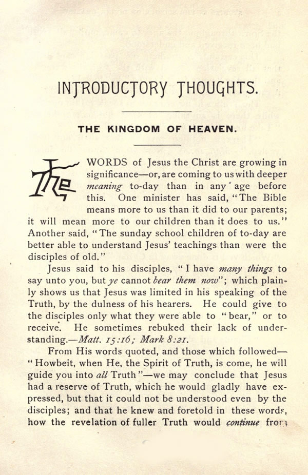 WORDS of Jesus the Christ are growing in significance - or, are coming to us with deeper meaning to-day than in any ' age before this. One minister has said, "The Bible means more to us than it did to our parents; it will mean more to our children than it does to us." Another said, "The Sunday school children of to-day are better able to understand Jesus' teachings than were the disciples of old."