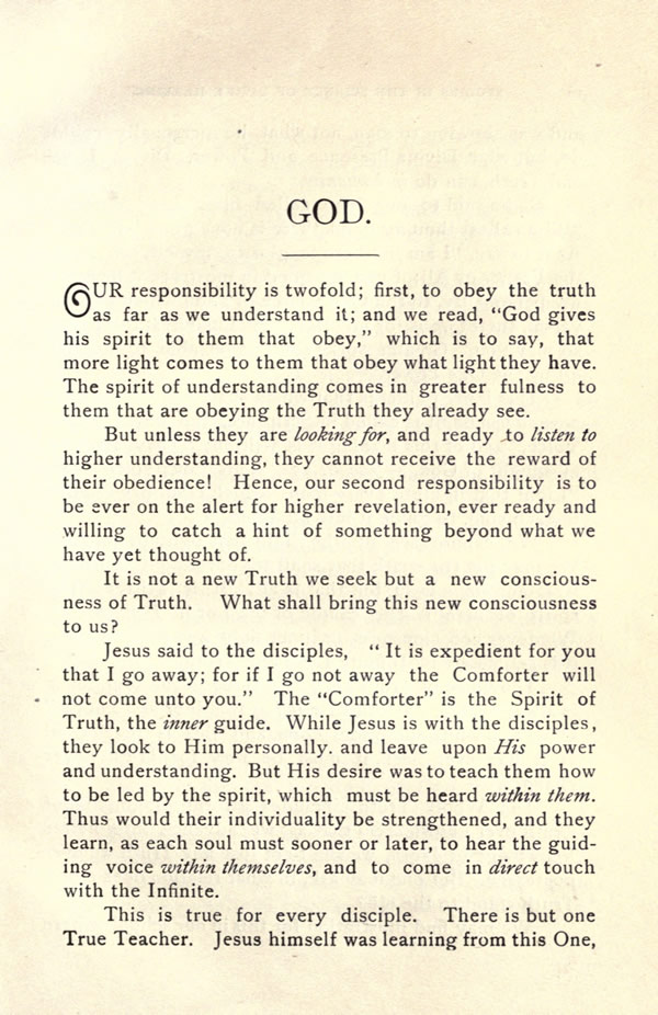Jesus said to the disciples, "It is expedient for you that I go away; for if I go not away the Comforter will not come unto you." The "Comforter" is the Spirit of Truth, the inner guide. While Jesus is with the disciples, they look to Him personally, and leave upon His power and understanding. But His desire was to teach them how to be led by the spirit, which must be heard within them. Thus would their individuality be strengthened, and they learn, as each soul must sooner or later, to hear the guiding voice within themselves, and to come in direct touch with the Infinite.