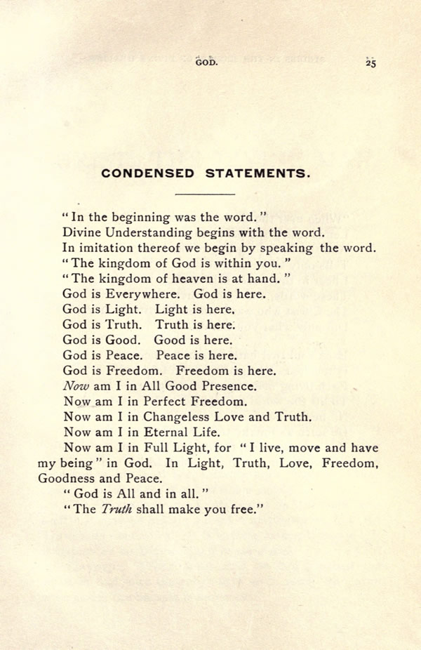 Important to All Readers - Introductory Thoughts - God - Condensed Statements - Christ, the Divine Man - Condensed Statements - Holy Ghost: Divine Consciousness - One, God, All - The Work of Thought - Silence Self, and Listen - The True I AM / The False I AM - Our Judgement Day - Practical Suggestions - Fasting - Deny Thyself - Prayer - I and My Father Are ONE - Growth: The Power of the Word - A Study of the Trinity - The Mountain of the Lord - The Mount of Consciousness - The Law of Heredity - What I Am NOT - Conclusion - What I AM - Some Final Words - Realization for Health