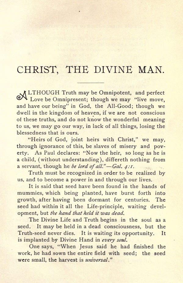 ALTHOUGH Truth may be Omnipotent, and perfect Love be Omnipresent; though we may "live move, and have our being" in God, the All-Good; though we dwell in the kingdom of heaven, if we are not conscious of these truths, and do not know the wonderful meaning to us, we may go our way, in lack of all things, losing the blessedness that is ours.