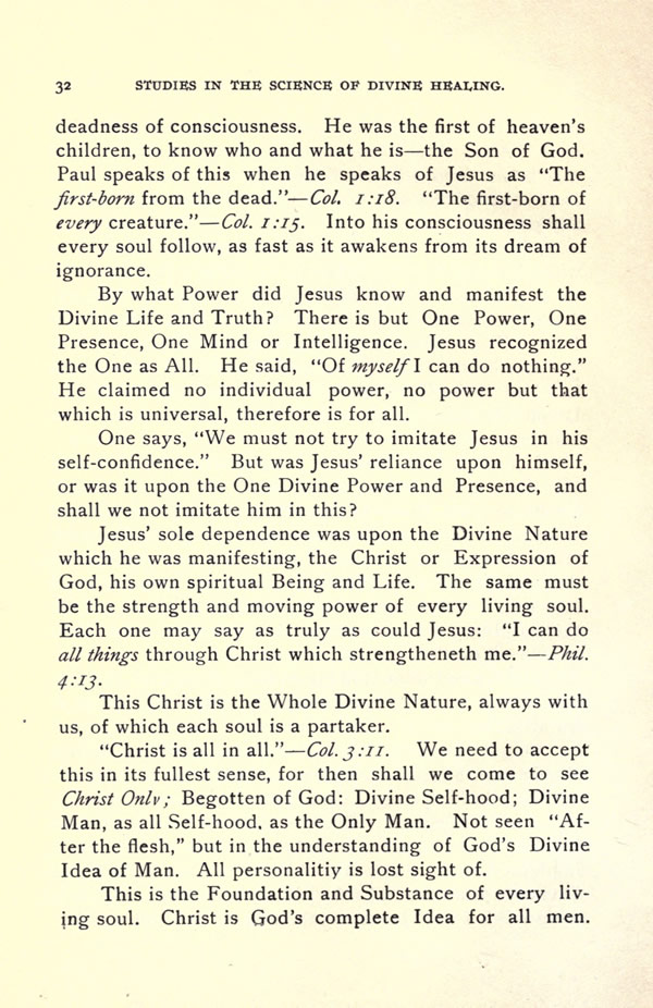 deadness of consciousness. He was the first of heaven's children, to know who and what he is -- the Son of God. Paul speaks of this when he speaks of Jesus as "The first-born from the dead." -- Col. 1:18. "The first-born of every creature." -- Col. 1:15. Into his consciousness shall every soul follow, as fast as it awakens from its dream of ignorance.