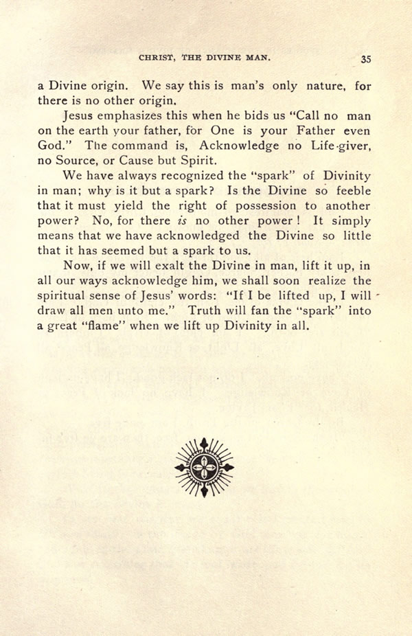 Now, if we will exalt the Divine in man, lift it up, in all our ways acknowledge him, we shall soon realize the spiritual sense of Jesus' words. "If I be lifted up, I will draw all men unto me." Truth will fan the "spark" into a great "flame" when we lift up Divinity in all.