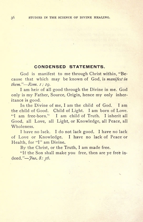 Important to All Readers - Introductory Thoughts - God - Condensed Statements - Christ, the Divine Man - Condensed Statements - Holy Ghost: Divine Consciousness - One, God, All - The Work of Thought - Silence Self, and Listen - The True I AM / The False I AM - Our Judgement Day - Practical Suggestions - Fasting - Deny Thyself - Prayer - I and My Father Are ONE - Growth: The Power of the Word - A Study of the Trinity - The Mountain of the Lord - The Mount of Consciousness - The Law of Heredity - What I Am NOT - Conclusion - What I AM - Some Final Words - Realization for Health