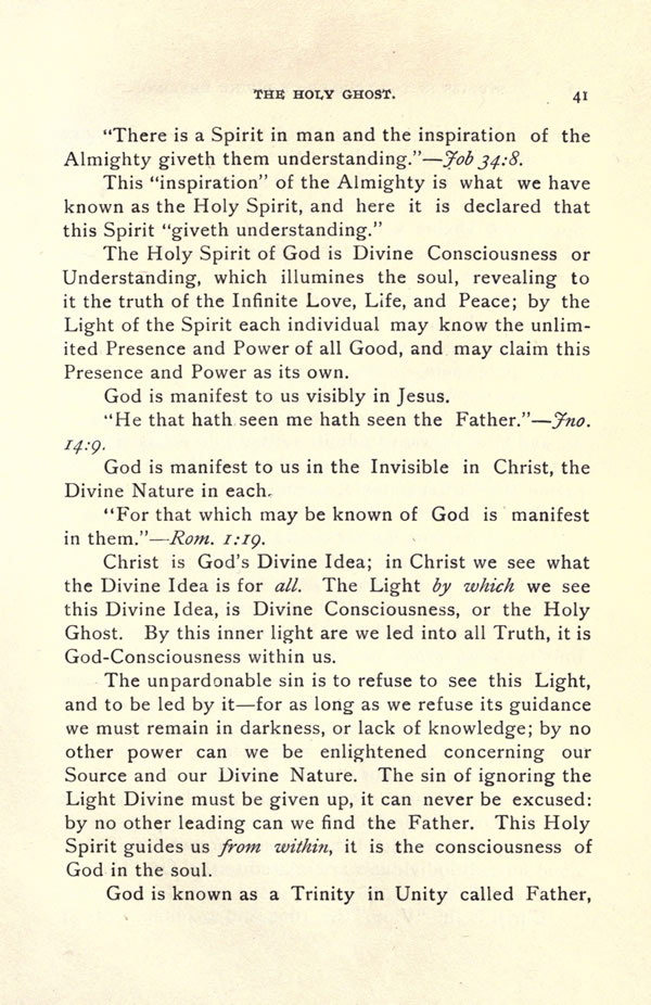 The Holy Spirit of God is Divine Consciousness or Understanding, which illumines the soul, revealing to it the truth of the Infinite Love, Life, and Peace; by the Light of the Spirit each individual may know the unlimited Presence and Power of all Good, and may claim this Presence and Power as its own.