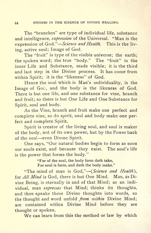 Hence the soul which is Man's individuality, is the Image of God, and the body is the likeness of God. There is but one life, and one substance for vine, branch and fruit; so there is but One Life and One Substance for Spirit, soul and body.