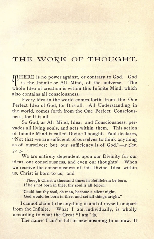 So God, as All Mind, Idea, and Consciousness, pervades all living souls, and acts within them. This action of Infinite Mind is called Divine Thought. Paul declares, "Not that we are sufficient of ourselves to think anything as of ourselves; but our sufficiency is of God." -- 2 Cor. 3:5