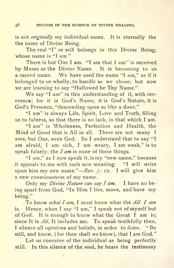 "I am," as I now speak it, is my "new name," because it appeals to me with such new meaning. "I will write upon him my new name." -- Rev. 3:12. I will give him a new consciousness of my name.