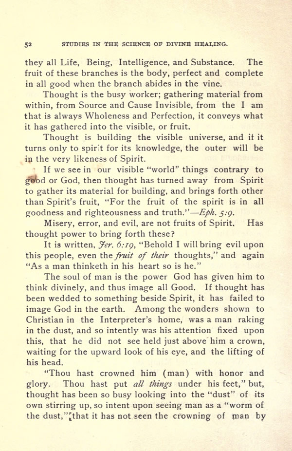 The soul of man is the power God has given him to think divinely, and thus image all Good. If thought has been wedded to something beside Spirit, it has failed to image God in the earth. Among the wonders shown to Christian in the Interpreter's home, was a man raking in the dust, and so intently was his attention fixed upon this, that he did not see held just above him a crown, waiting for the upward look of his eye, and the lifting of his head.