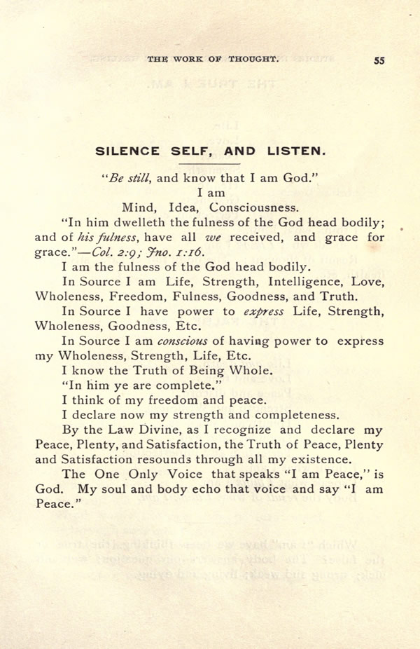 Important to All Readers - Introductory Thoughts - God - Condensed Statements - Christ, the Divine Man - Condensed Statements - Holy Ghost: Divine Consciousness - One, God, All - The Work of Thought - Silence Self, and Listen - The True I AM / The False I AM - Our Judgement Day - Practical Suggestions - Fasting - Deny Thyself - Prayer - I and My Father Are ONE - Growth: The Power of the Word - A Study of the Trinity - The Mountain of the Lord - The Mount of Consciousness - The Law of Heredity - What I Am NOT - Conclusion - What I AM - Some Final Words - Realization for Health