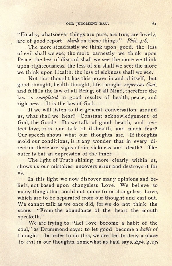 Not that thought has this power in and of itself, but good thought, health thought, life thought, expresses God, and fulfills the law of all Being, of all Mind, therefore the law is completed in good results of health, peace, and Tightness. It is the law of God.