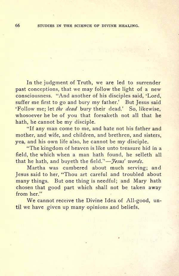 In the judgment of Truth, we are led to surrender past conceptions, that we may follow the light of a new consciousness. "And another of his disciples said, 'Lord, suffer me first to go and bury my father.' But Jesus said 'Follow me; let the dead bury their dead.' So, likewise, whosoever he be of you that forsaketh not all that he hath, he cannot be my disciple.