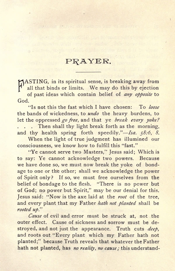 "Ye cannot serve two Masters," Jesus said; Which is to say: Ye cannot acknowledge two powers. Because we have done so, we must now break the yoke of bondage to one or the other; shall we acknowledge the power of Spirit only? If so, we must free ourselves from the belief of bondage to the flesh. "There is no power but of God; no power but Spirit," may be our denial for this. Jesus said. "Now is the axe laid at the root of the tree, and every plant that my Father hath not planted shall be rooted up."
