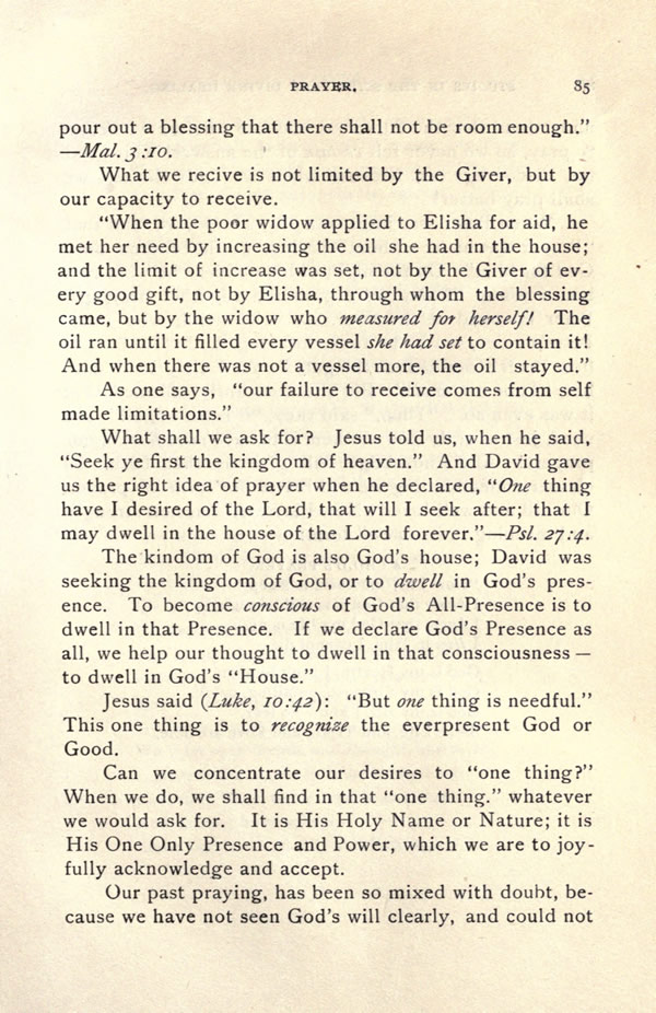 "When the poor widow applied to Elisha for aid, he met her need by increasing the oil she had in the house; and the limit of increase was set, not by the Giver of every good gift, not by Elisha, through whom the blessing came, but by the widow who measured for herself! The oil ran until it filled every vessel she had set to contain it! And when there was not a vessel more, the oil stayed."