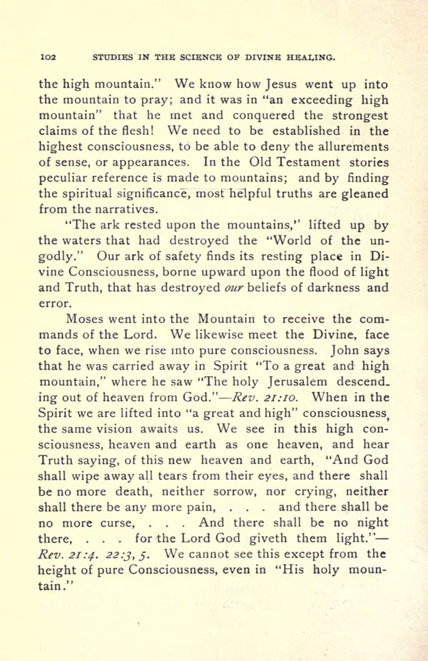 Moses went into the Mountain to receive the commands of the Lord. We likewise meet the Divine, face to face, when we rise into pure consciousness. John says that he was carried away in Spirit. "To a great and high mountain," where he saw "The holy Jerusalem descending out of heaven from God." -- Rev.21:10. When in the Spirit we are lifted into "a great and high" consciousness, the same vision awaits us. We see in this high consciousness, heaven and earth as one heaven, and hear Truth saying, of this new heaven and earth, "And God shall wipe away all tears from their eyes, and there shall be no more death, neither sorrow, nor crying, neither shall there be any more pain, . . . and there shall be no more curse, . . . And there shall be no night there, . . . for the Lord God giveth them light." -- Rev. 21:4. 22:3, 5. We cannot see this except from the height of pure Consciousness, even in "His holy mountain."