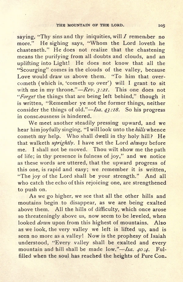 saying, "Thy sins and thy iniquities, will I remember no more." He sighing says, "Whom the Lord loveth he chasteneth." He does not realize that the chastening means the purifying from all doubts and clouds, and an uplifting into Light! He does not know that all the "Scourging" comes in the clouds of the valley, because Love would draw us above them. "To him that overcometh (which is, 'cometh up over') will I grant to sit with me in my throne." -- Rev. 3:21. This one does not "Forget the things that are being left behind," though it is written, "Remember ye not the former things, neither consider the things of old." -- Isa. 43:18. So his progress in consciousness is hindered.