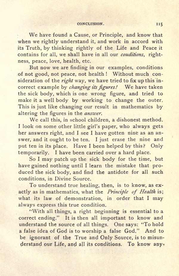But now we are finding in our examples, conditions of not good, not peace, not health! Without much consideration of the right way, we have tried to fix up this incorrect example by changing its figures! We have taken the sick body, which is one wrong figure, and tried to make it a well body by working to change the outer. This is just like changing our result in mathematics by altering the figures in the answer.