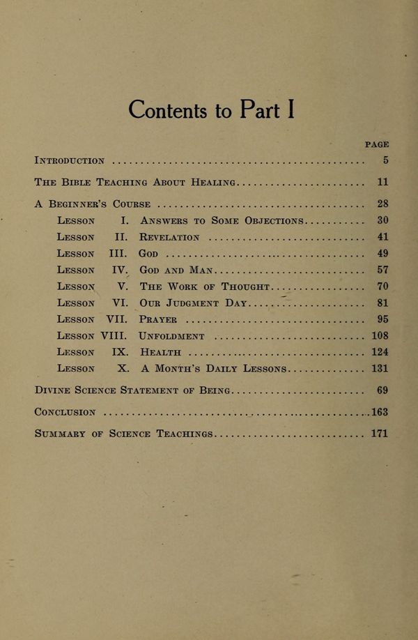 Introduction - The Bible Teaching about Healing - A Beginner's Course - Answers to Some Objections - Revelation - God - God and Man - The Work of Thought - Our Judgment Day - Prayer - Unfoldment - Health - A Month's Daily Lessons - Divine Science Statement of Being - Conclusion - Summary of Science Teachings -