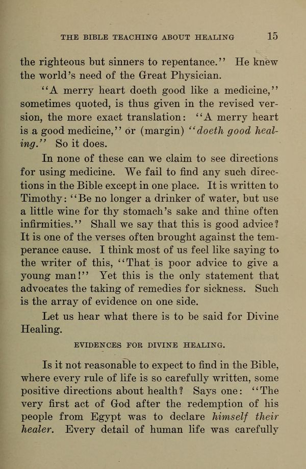 In none of these can we claim to see directions for using medicine. We fail to find any such directions in the Bible except in one place. It is written in Timothy: "Be no longer a drinker of water, but us a little wine for thy stomach's sake and thine often infirmities." Shall we say that this is good advice?