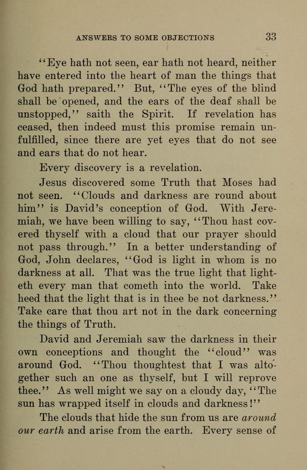 "Eye hath not seen, ear hath not heard, neither have entered into the heart of man the things that God hath prepared." But, "The eyes of the blind shall be opened, and the ears of the deaf shall be unstopped," saith the Spirit. If revelation has ceased, then indeed must this promise remain unfulfilled, since there are yet eyes that do not see and ears that do not hear.
