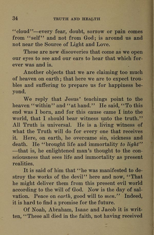 We reply that Jesus' teachings point to the heaven "within" and "at hand." He said, "To this end was I born, and for this cause came I into the world, that I should bear witness unto the truth." All Truth is universal. He is a living witness of what the Truth will do for every one that receives it. Here, on earth, he overcame sin, sickness and death. He "brought life and immortality to light" --- that is, he enlightened man's thought to the consciousness that sees life and immortality as present realities.