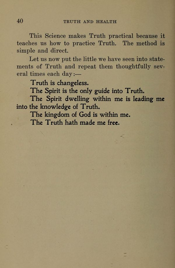 Truth is changeless. The Spirit is the only guide into Truth. The Spirit dwelling within me is leading me into the knowledge of Truth. The kingdom of God is within me. The Truth hath made me free.