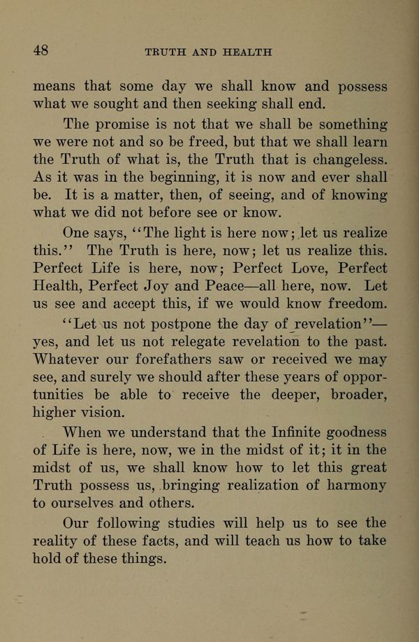 One says, "The light is here now; let us realize this." The Truth is here, now; let us realize this. Perfect Life is here, now; Perfect Love, Perfect Health, Perfect Joy and Peace --- all here, now. Let us see and accept this, if we would know freedom.