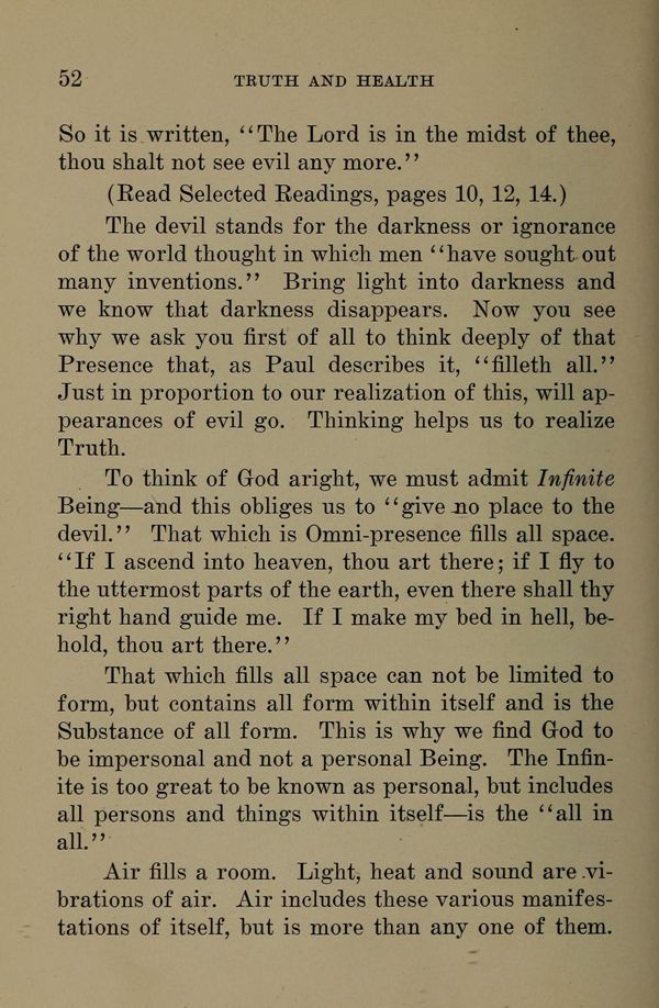 The devil stands for the darkness or ignorance of the world thought in which men "have sought out many inventions." Bring light into darkness and we know that darkness disappears. Now you see why we ask you first of all to think deeply of that Presence that, as Paul describes it, "filleth all." Just in proportion to our realization of this, will appearances of evil go. Thinking helps us to realize Truth.