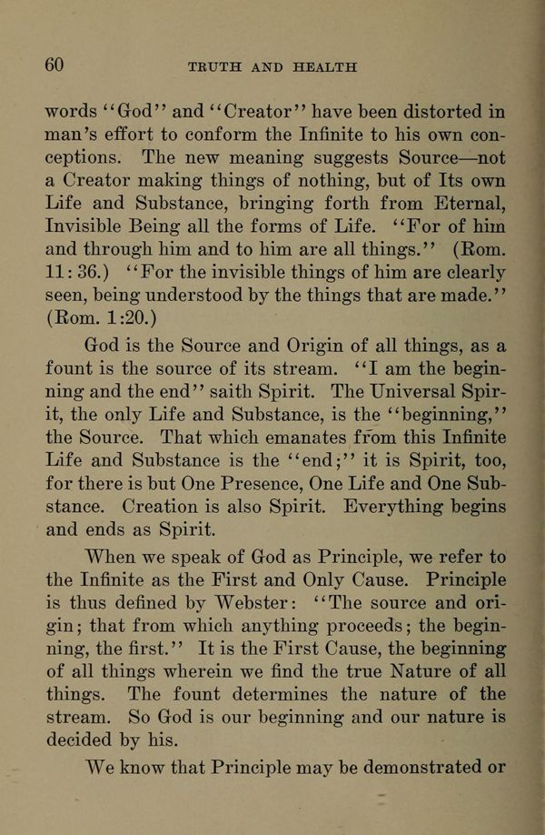 The words "God" and "Creator" have been distorted in man's effort to conform the Infinite to his own conceptions. The new meaning suggests Source --- not a Creator making things of nothing, but of Its own Life and Substance, bringing forth from Eternal, Invisible Being all the forms of Life. "For of him and through him and to him are all things." (Rom. 11: 36.) "For the invisible things of him are clearly seen, being understood by the things that are made." (Rom. 1: 20.)