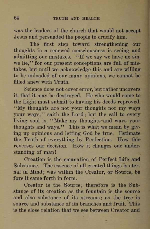 Science does not cover error, but rather uncovers it, that it may be destroyed. He who would come to the Light must submit to having his deeds reproved. "My thoughts are not your thoughts nor my ways your ways," saith the Lord; but the call to every living soul is, "Make my thoughts and ways your thoughts and ways." This is what we mean by giving up opinions and letting God be true. Estimate the Truth of everything by Perfection. How this reverses our decision. How it changes our understanding of man!