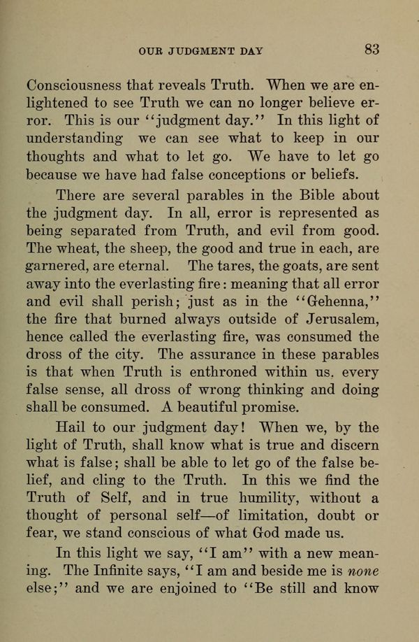 There are several parables in the Bible about the judgment day. In all, error is represented as being separated from Truth, and evil from good. The wheat, the sheep, the good and true in each, are garnered, are eternal. The tares, the goats, are sent away into the everlasting fire: meaning that all error and evil shall perish; just as in the "Gehenna," the fire that burned always outside of Jerusalem, hence called the everlasting fire, was consumed the dross of the city. The assurance in these parables is that when Truth is enthroned within us, every false sense, all dross of wrong thinking and doing shall be consumed. A beautiful promise.